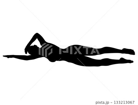 クロール 水泳でクロールを泳ぐ女性のシルエット 全身 横向き 正面のイラスト