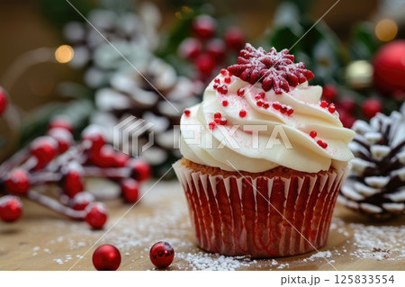 Festive Christmas Cupcake with Cream Frosting and Holiday Decorations
