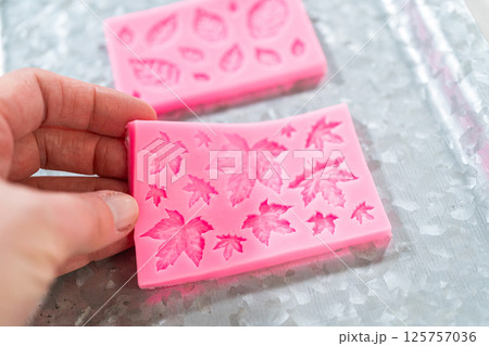 Making chocolate leaves from melted chocolate to decorate the pumpkin bundt cake.