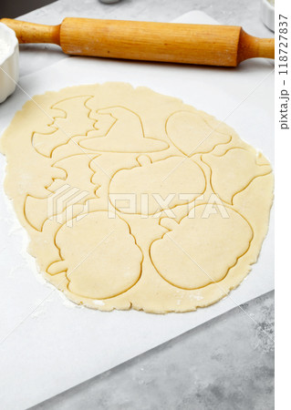 Making different shapes of fall cookies for Halloween. Dough with cookie cutter