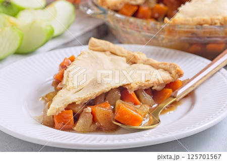 Apple and sweet potato cobbler pie showing filling ingredients, horizontal closeup