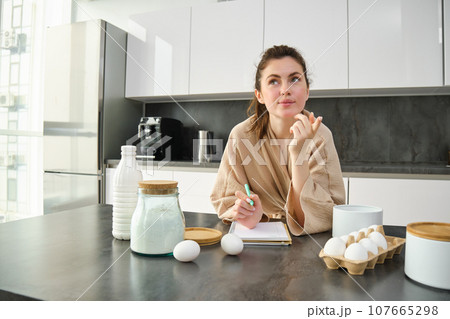 Attractive young cheerful girl baking at the kitchen, making dough, holding recipe book, having ideas