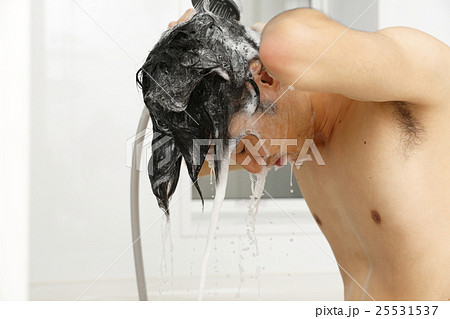シャワーで泡を洗い流す若い日本人男性 洗髪 バスルーム