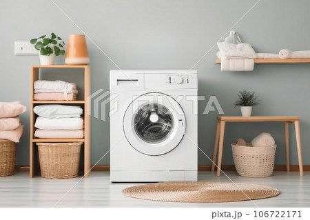 Domestic room interior with modern washing machine and laundry baskets