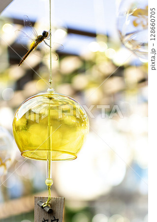 風鈴にトンボが止まった