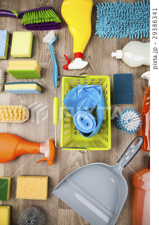 Sponges, garbage bags and a hand with bottles of washing and cleaning liquids on the beige background.