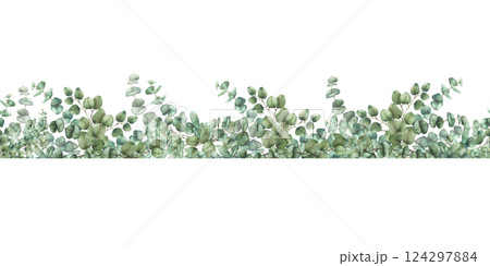Eucalyptus green leaves branches seamless border. Greenery Watercolor pattern silver dollar tree twigs hand drawn botanical illustration for church, baptism fabric design isolated from background