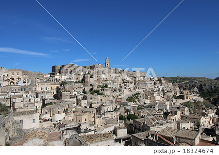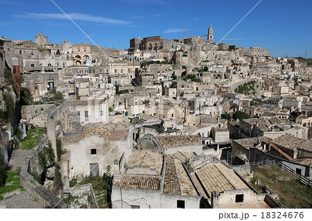 ドゥオーモの尖塔を見るマテーラ洞窟住居群風景
