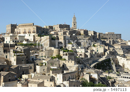 ドゥオーモの尖塔を見るマテーラ洞窟住居群風景
