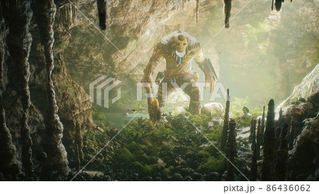 A horrible troll stands in his cave in front of the remains of skeletons and bones. A giant troll is getting ready to hunt. 3D Rendering.