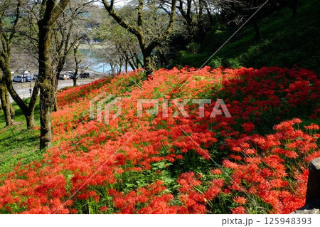 彼岸花咲く桜林より湖を望む 【相模原市津久井 10月】