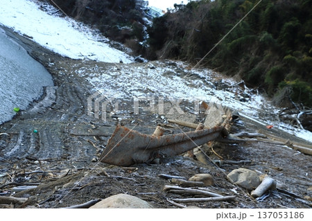 【神奈川県】記録的渇水により津久井湖の湖底から数十年ぶりに姿を現した旧国道413号線