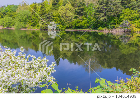 春の青森県鶴田町 津軽富士見湖のリンゴ(ズミ)の咲く島