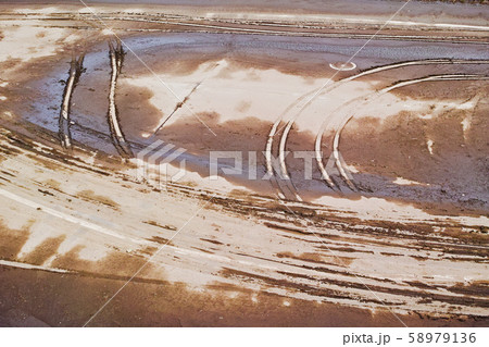 水が引いた後の今田遊水地の半乾きの舗装路面に残る轍
