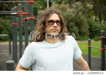 Portrait of caucasian man in casual clothes stands, relax and enjoying at public park near sport ground equipment. Relaxed and contentment. Outdoors. Summer.