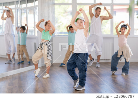 Dance group of children in casual clothes are training together to dance hip-hop and breakdancing in dance center