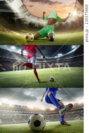 Collage of green footballer sliding in celebration with red and blue striking moments on 3D field