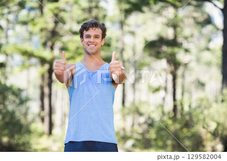 Smiling man extending arms with thumbs up in sunlit forest clearing wearing athletic wear