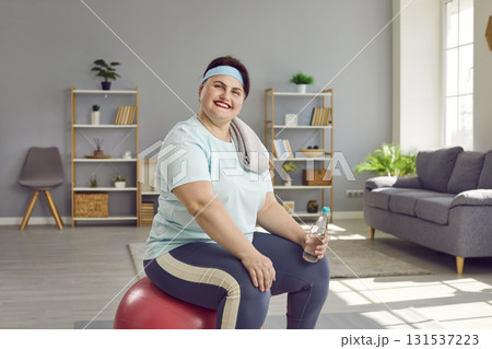 Fat woman wearing sportswear sitting on fit ball with a bottle of water after fit exercises at home