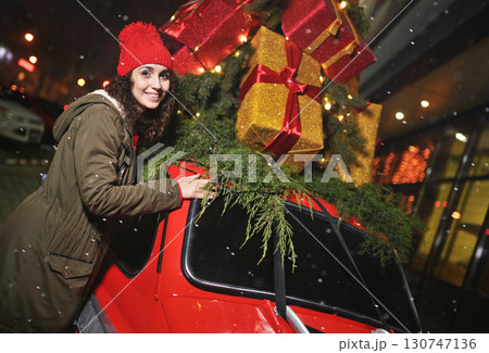 a pretty young woman in a red hat with a bubo smiles against the backdrop of a red retro car with Christmas gifts on the roof, Christmas lights and snow.