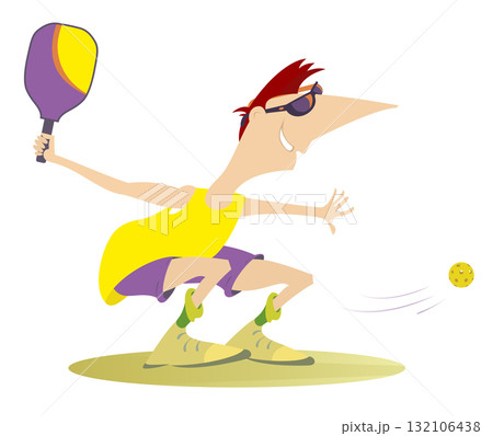 Smiling young man playing pickleball. Cartoon man plays pickleball