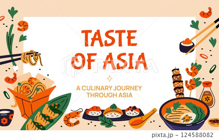Asian food frame. Traditional japanese, korean, thai and chinese meal, noodles, sushi, soy sauce, exotic dishes, seafood banner design, cartoon flat style isolated garish vector concept