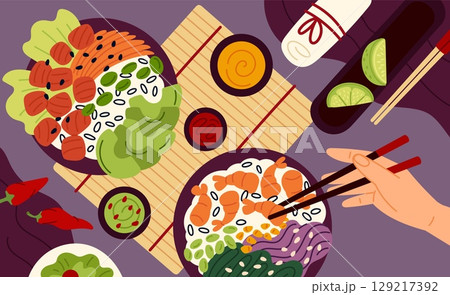 Poke bowl table. Top view serving, hand with chopsticks, asian healthy food, rice, vegetables, salmon and meat, meal ion restaurant, cartoon flat style isolated garish vector concept