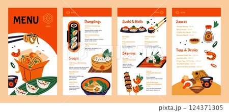 Asian food menu template. Restaurant cuisine list of dishes design, chinese, korean, japanese traditional food, seafood and noodles cartoon flat style isolated garish vector concept
