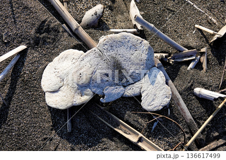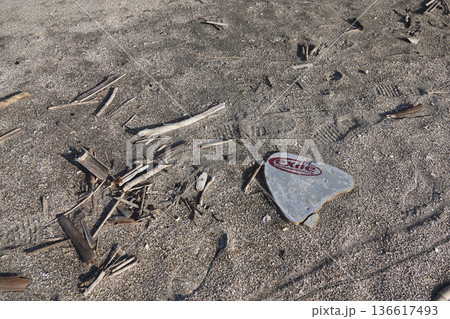 波打ち際の砂浜に埋もれた漂流物
