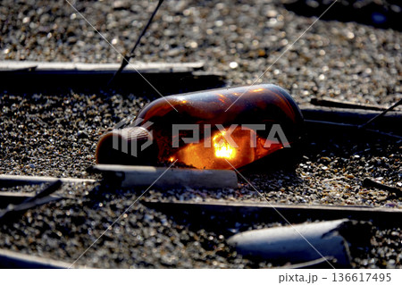 波打ち際の漂流物 夕陽に反射して輝く茶色の小瓶