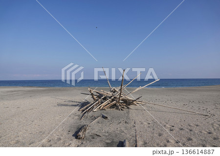 波打ち際の砂浜に集められた流木と漂着物