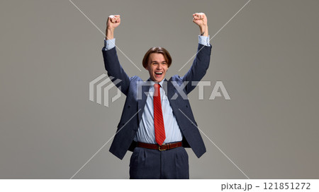 Celebrating with arms raised triumphantly, man in suit beams with excitement and energy against gray studio background.