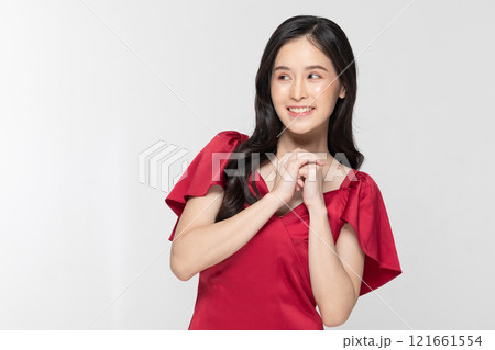 Dreamy young woman in red dress looking away with a hopeful expression, white studio background