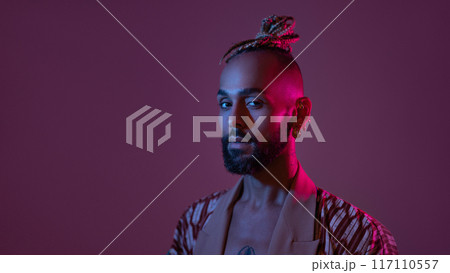 Neon light studio close-up portrait handsome black