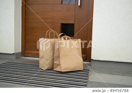 Delivery food in paper bag for customer during corona virus spreading at front door home