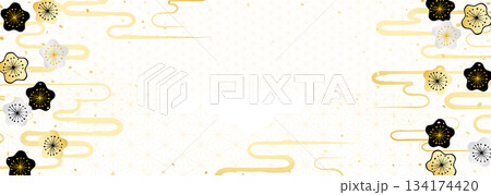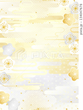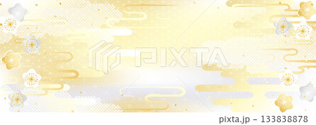 金銀の梅の花と日本の伝統模様を組み合わせた華やかな背景イラスト