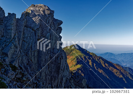 中央アルプス・宝剣岳稜線の天狗岩と三ノ沢岳