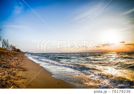 琵琶湖砂浜湖岸日暮れ
