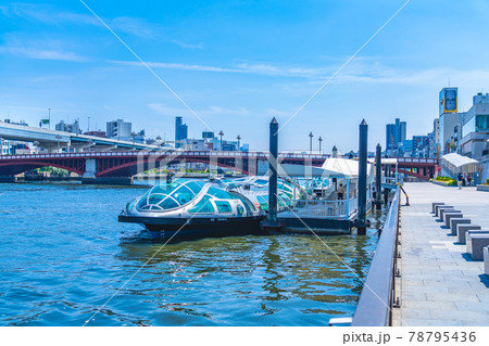 浅草の水上バス乗り場と桟橋に停泊中の遊覧船