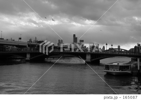日本の東京都市景観 水上バス・いりすや隅田川、すみだリバーウォーク、電車などを望む