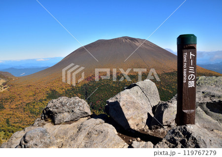 浅間山外輪山の蛇骨岳山頂標識 背景は浅間山と剣ケ峰 2023年9月19日