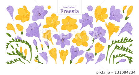 Freesia branches set, isolated on transparent background, Flower illustration in yellow and purple colors, hand-drawn style.