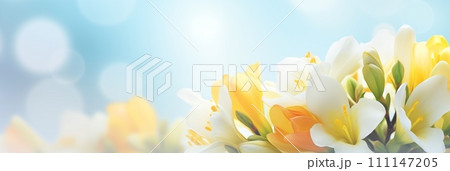 Spring flowers banner, background. Freesia flowers banner with copy space