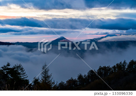 夜明けの高ボッチ高原から諏訪湖の雲海と雲間にそびえる富士山