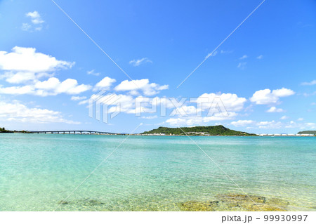 【沖縄県】快晴の浜比嘉島から見た宮城島と浜比嘉大橋