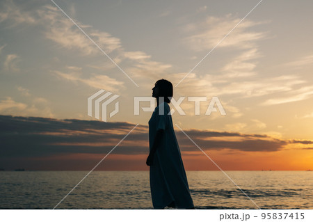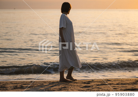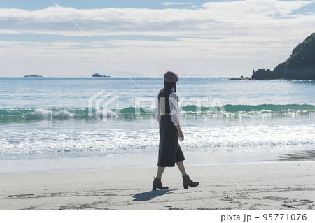 朝日で輝く秋の海の砂浜を歩く女性(静岡県 伊豆 弓ヶ浜)