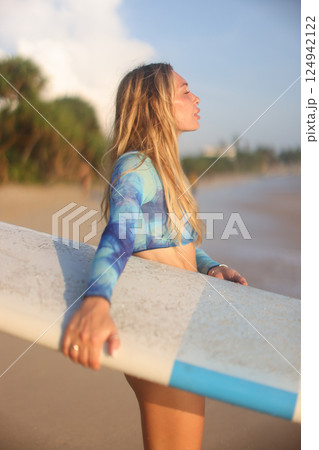 Young woman wearing tight wetsuit is going to surfboard at beautiful beach