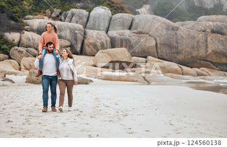 Family, walking and beach, travel and outdoor, mother and father with child spending quality time by the ocean. Love, together and man with woman and girl, parents bonding with kid out in nature.