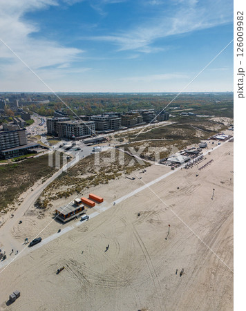 Aerial view of a modern beachside development with apartment buildings, sand dunes, and a wide sandy beach under a clear blue sky. People walk along the path and tracks mark the sand.