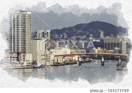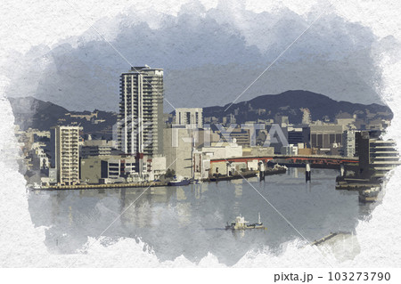 水彩画風 長崎市街地 グラバー園からの長崎港 浦上川河口 長崎県長崎市